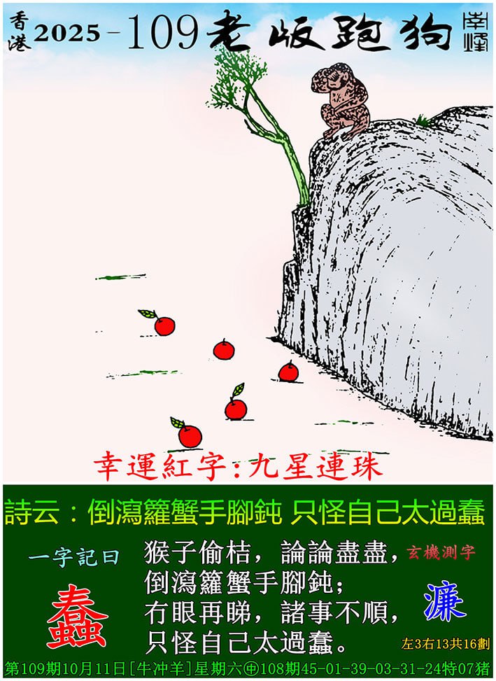 | 主题 :109期老版跑狗一字記之曰:【蠢】 玄機測字:《濂》 |