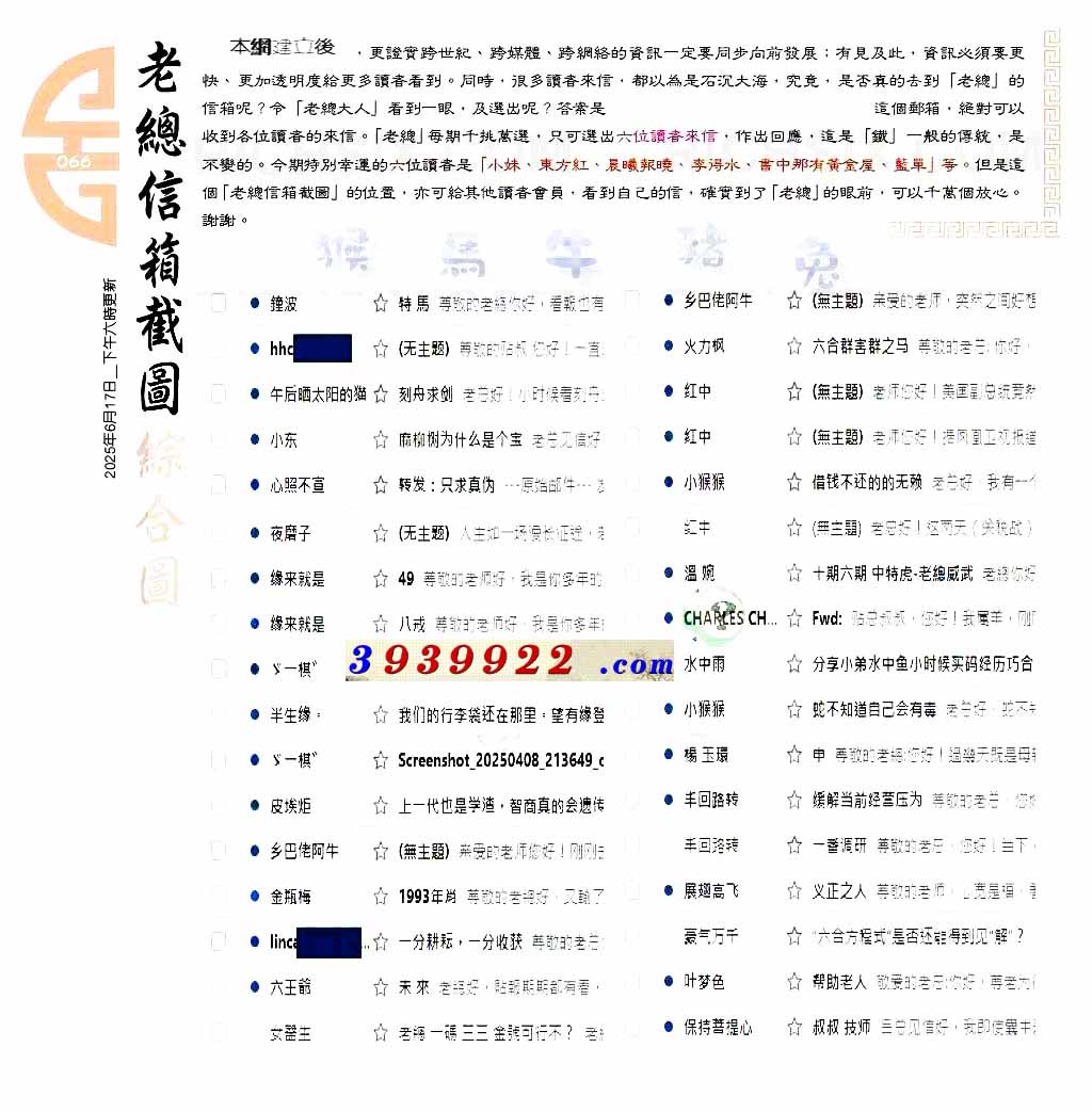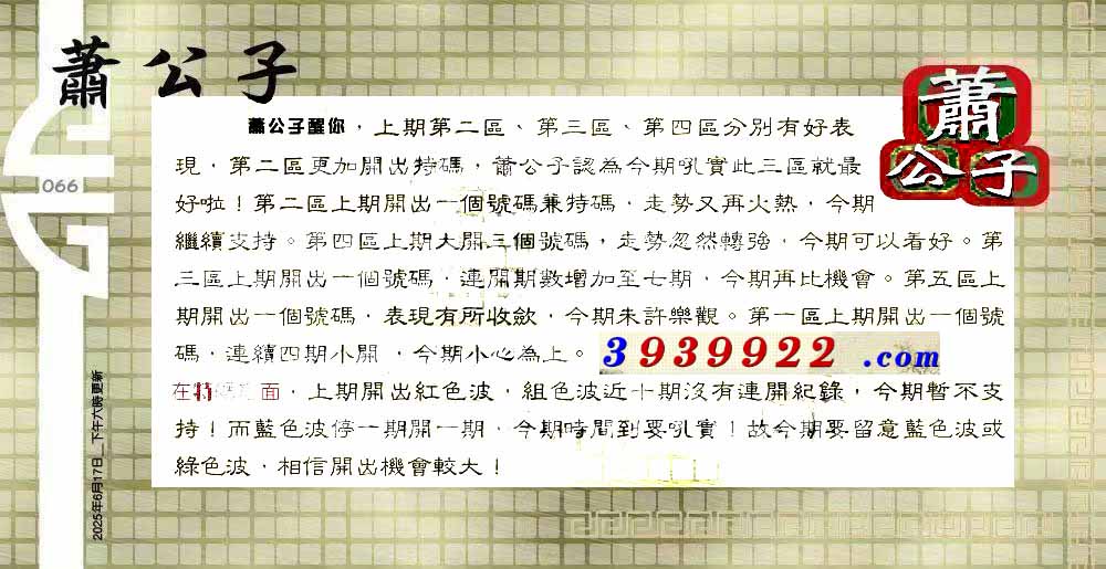 | 主题 :066期:六合皇金句/老总论码/萧公子/林大师/五行夺码/老总信箱截 |
