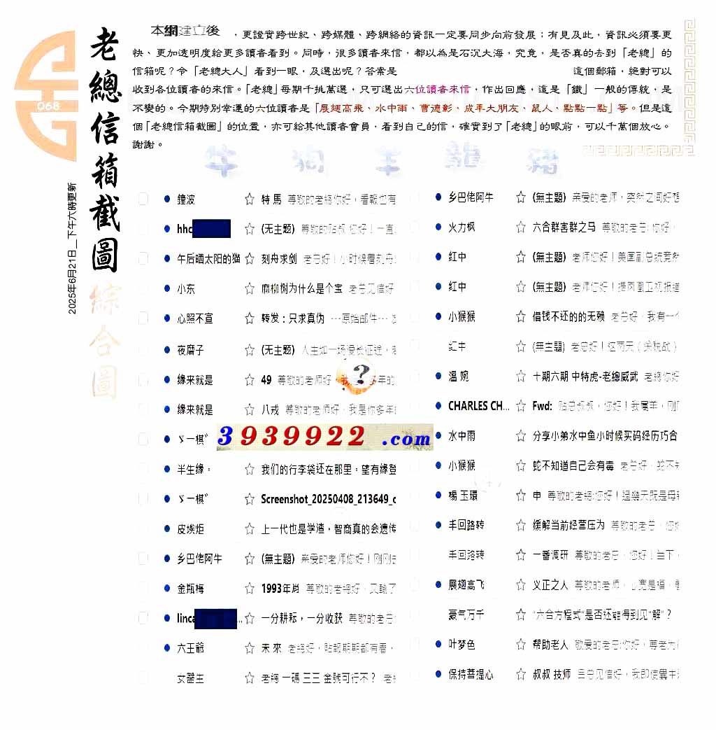 主题 :068期:六合皇金句/老总论码/萧公子/林大师/五行夺码/老总信箱截