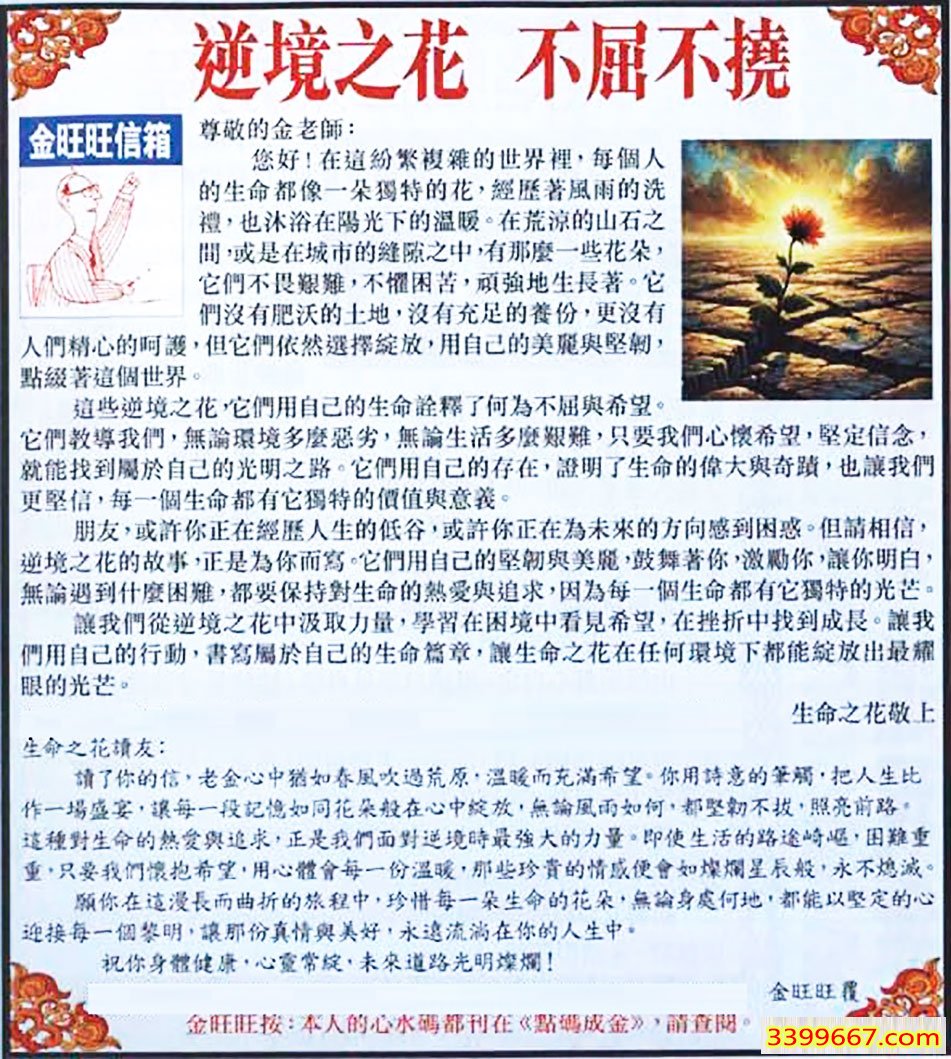 | 主题 :070期:金旺旺信箱彩民推荐→→《逆境之花 不屈不撓》 |