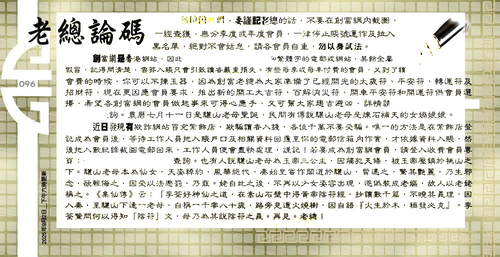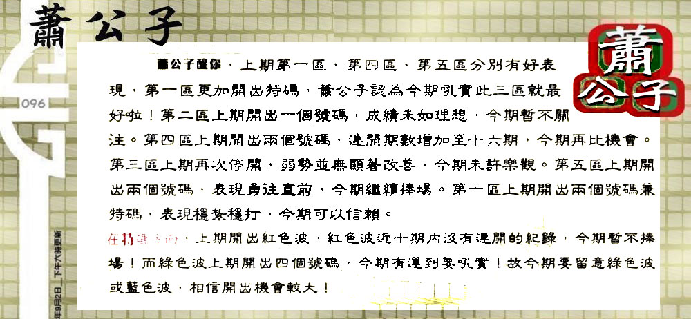 主题 :096期:六合皇金句/老总论码/萧公子/林大师/五行夺码/老总信箱截 |