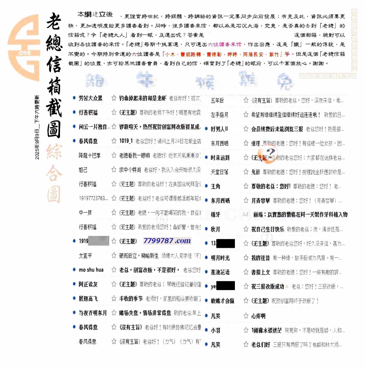 主题 :098期:六合皇金句/老总论码/萧公子/林大师/五行夺码/老总信箱截 |