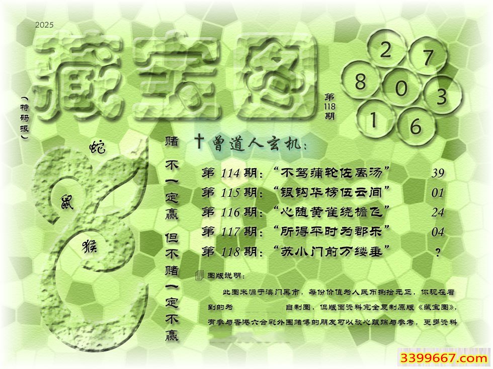 | 主题 :118期藏寶圖 新:苏小门前万缕垂 老:伴人东去到江城 禁:羊 禁:5尾 |