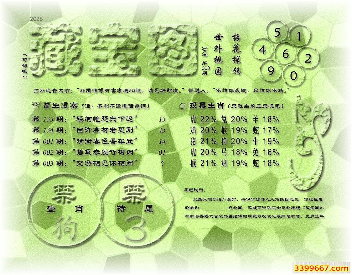 | 主题 :003期藏寶圖 新:君今旧隐治叁泾 老:交游相见休相问 禁:狗 禁:3尾 |