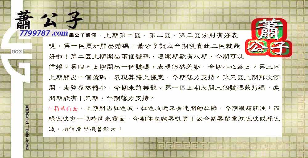 | 主题 :003期:六合皇金句/老总论码/萧公子/林大师/五行夺码/老总信箱截 |