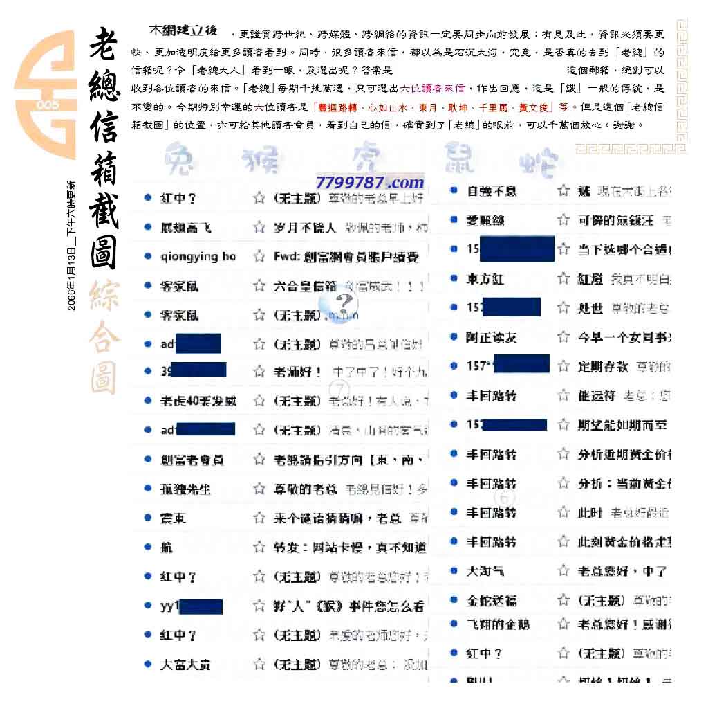 | 主题 :005期:六合皇金句/老总论码/萧公子/林大师/五行夺码/老总信箱截 |