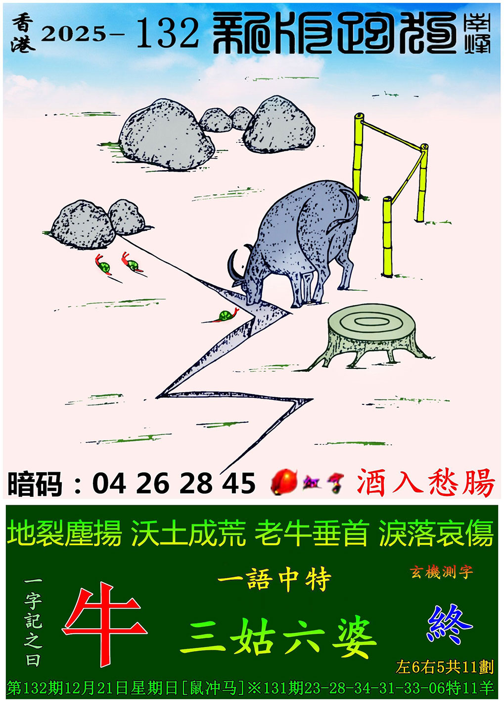 | 主题 :132期:新版跑狗一字記之曰【牛】 玄機測字:【終】 |